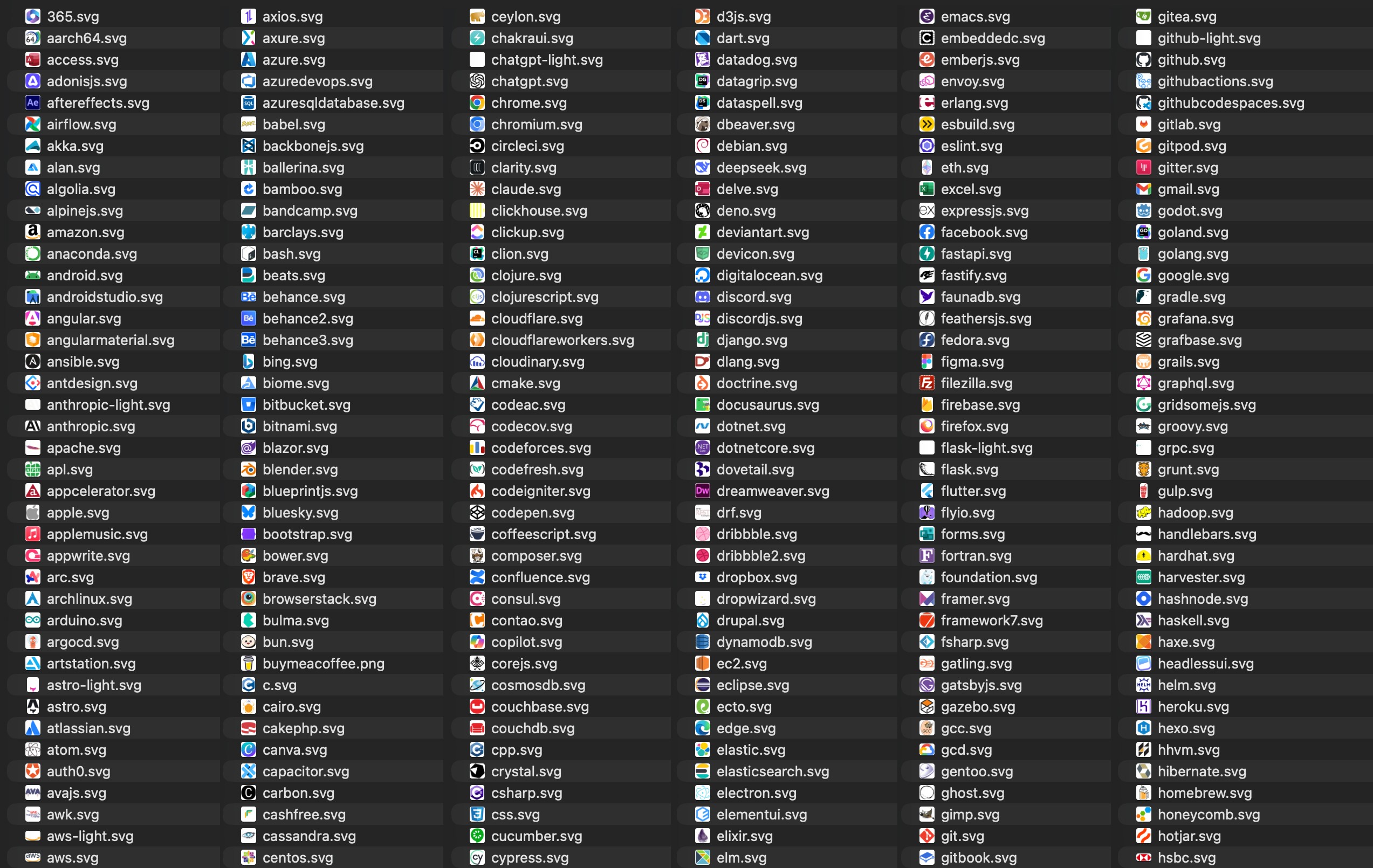 For chips in the sidebar and contacts, there is a vector set of 600+ icons, including programming languages, tools, and social networks. If a tool or language is missing, you can easily add a new icon to the vector or raster sets and use them. Here are some of the icons: